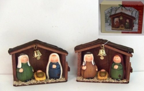 Idea Natale: PRESEPE 3 soggetti con CAPANNA in LEGNO e CAMPANA. H 11,5cm BASE 17x6,5cm - Migliori tariffe